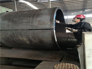 ①卷板成型的鋼管在每段焊接完畢后,需上機(jī)‘校圓’,在弧度偏小的部位往復(fù)滾卷,去除內(nèi)應(yīng)力,提高鋼管圓度。
